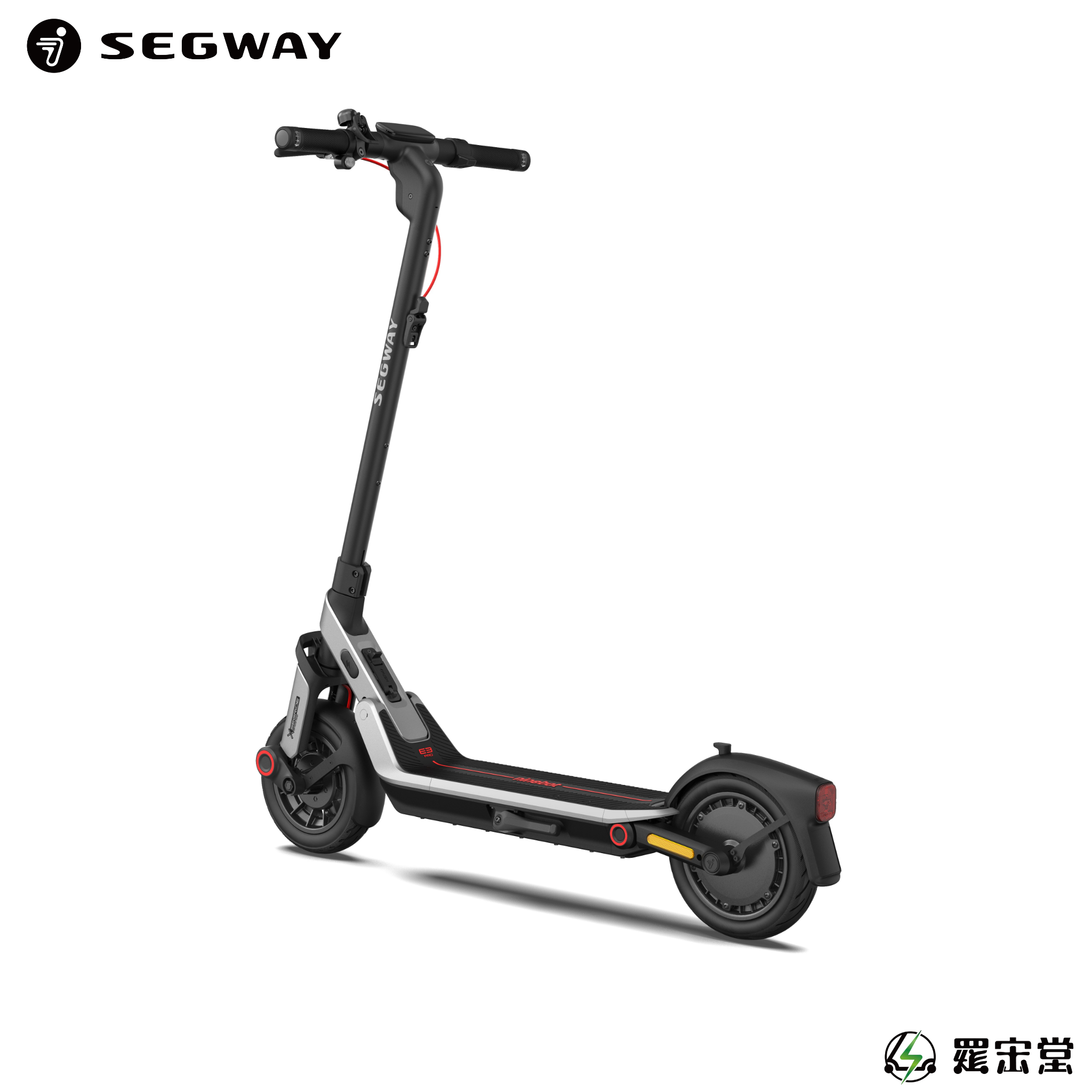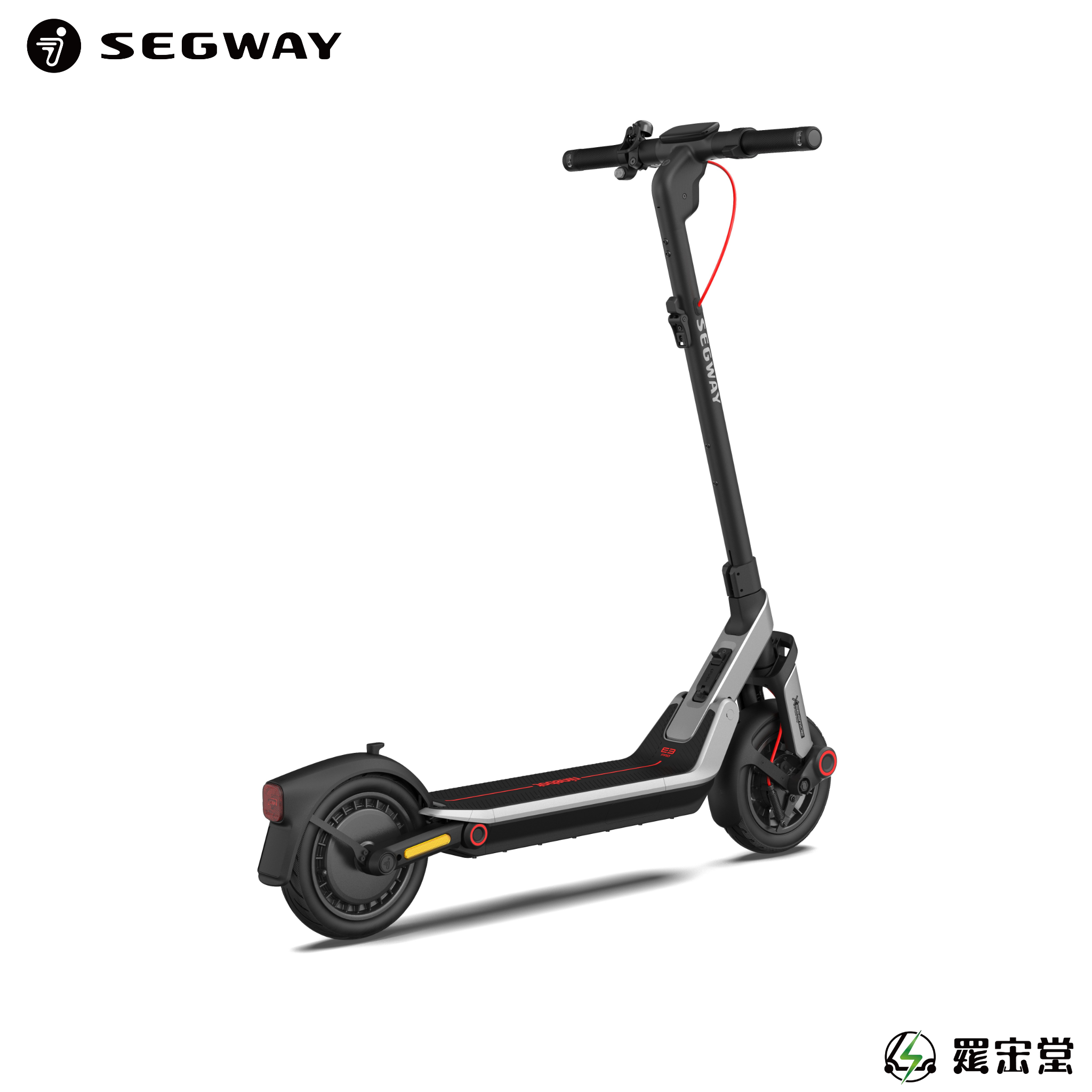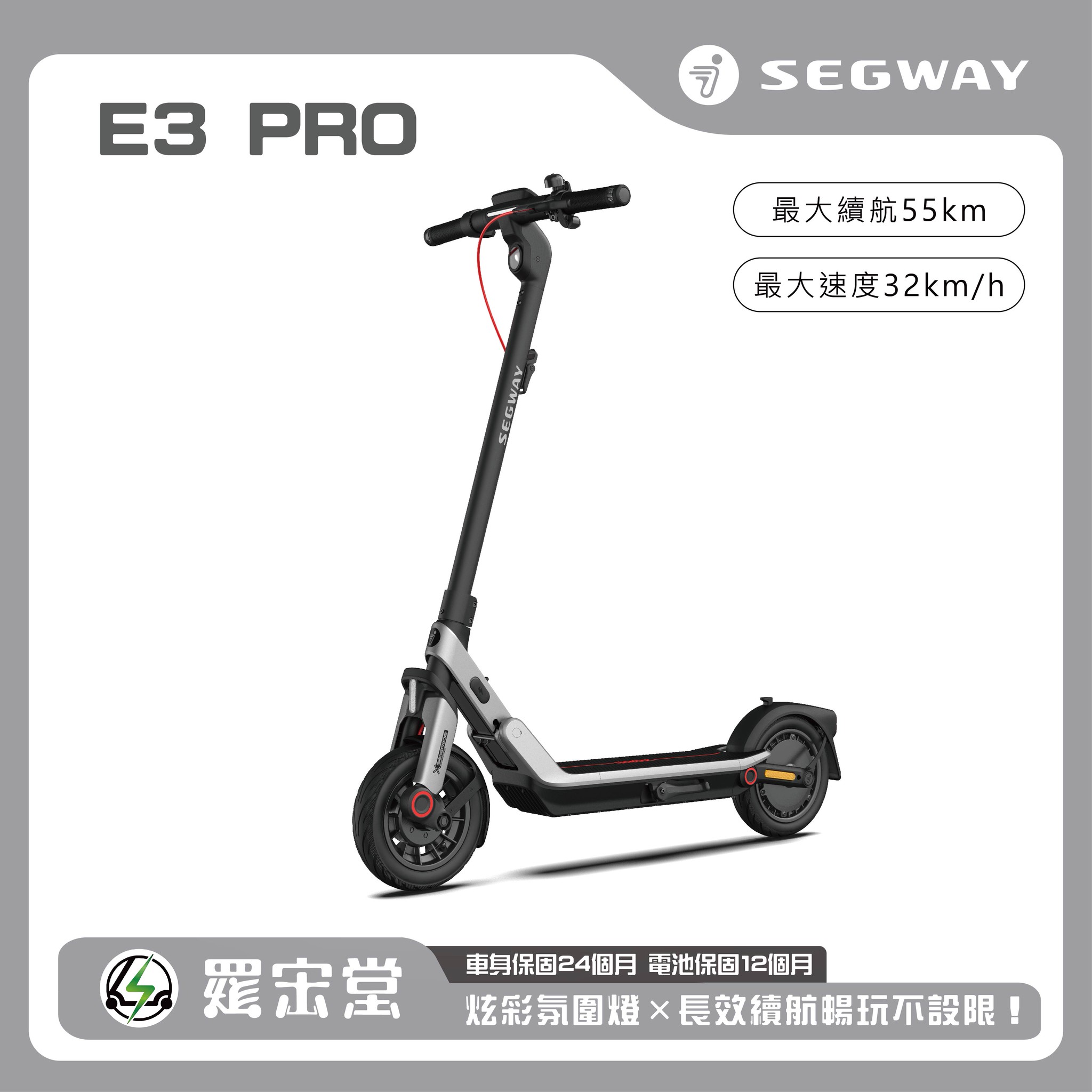 SEGWAY電動滑板車 E3 Pro,搭載前後輪避震系統,全車系採用10吋真空胎,鼓煞+電子剎雙輪制動更安全,延續E系列之底盤氛圍燈設計聚光式超亮LED一體式設計前燈搭載轉向燈,行車轉向更順暢平安,鎂鋁合金車架更輕巧,快速折疊易收易開,續航力可達55公里,後輪驅動馬達時速可達32公里,爬坡力可達18%,支援Apple Find My定位功能,TCS防滑系統,以前瞻性科技與卓越工藝,為您的每一次騎行注入非凡體驗!