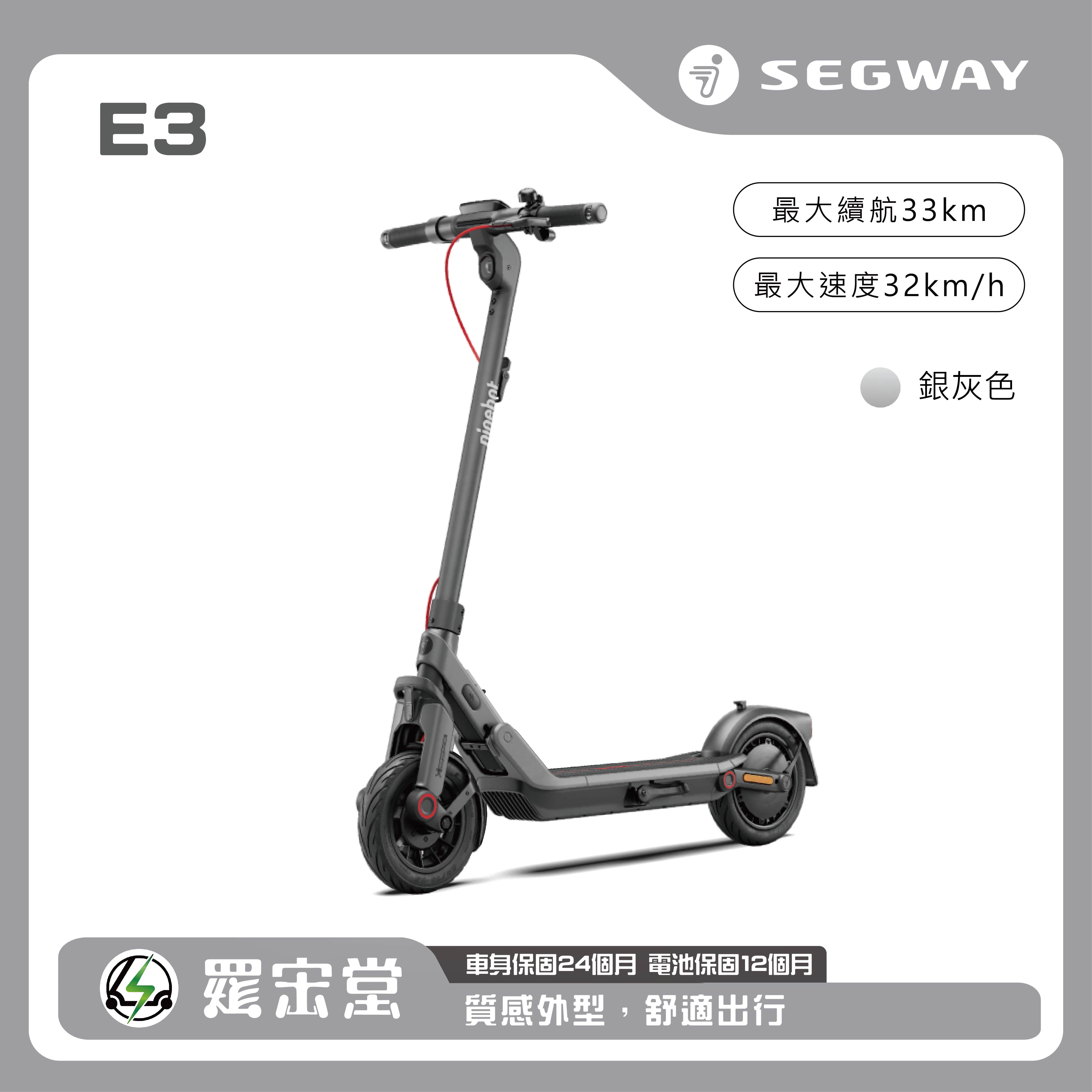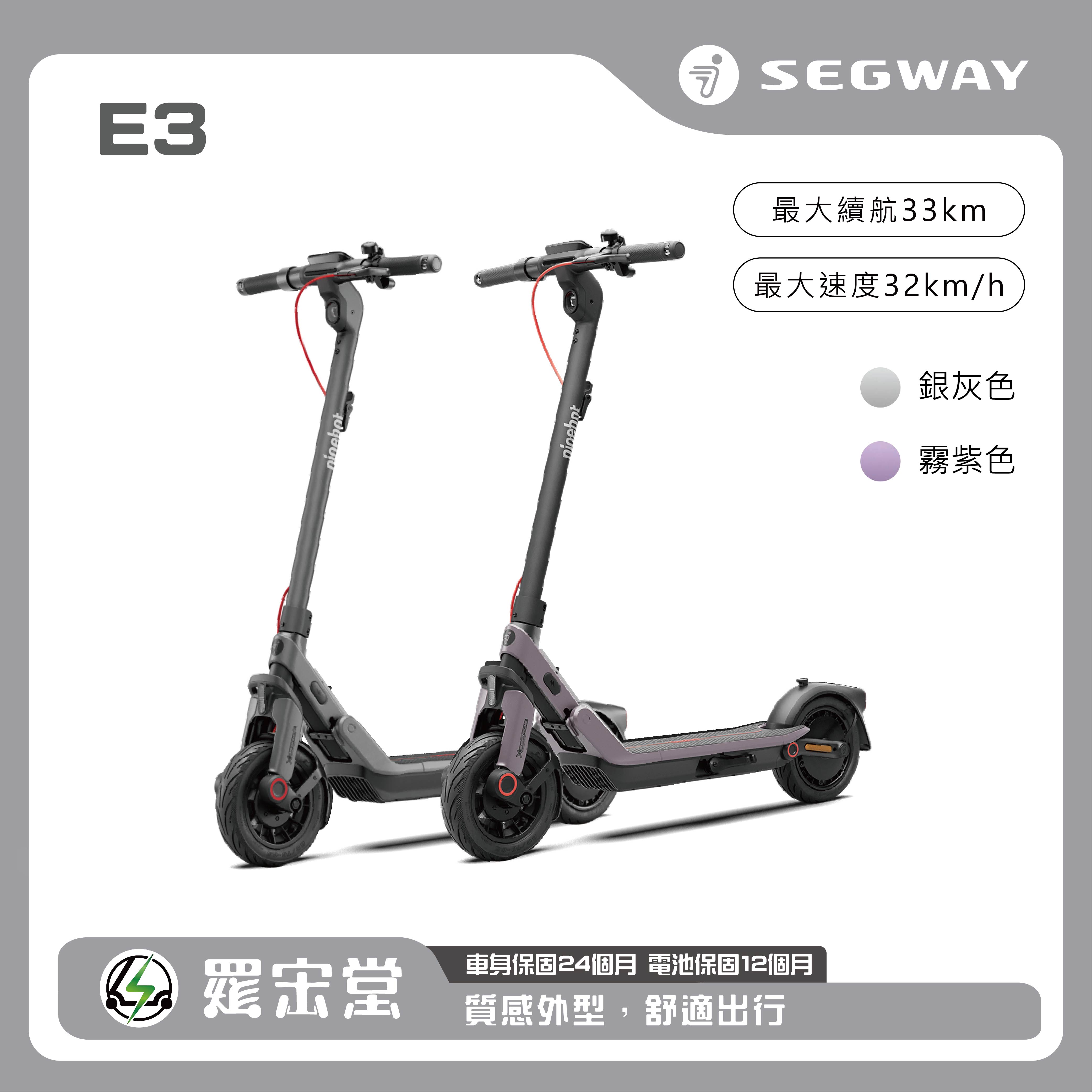 SEGWAY電動滑板車 E3,搭載前後輪避震系統,全車系採用10吋真空胎,鼓煞+電子剎雙輪制動更安全,聚光式超亮LED一體式設計前燈搭載轉向燈,行車轉向更順暢平安,鎂鋁合金車架更輕巧,快速折疊易收易開,續航力可達33公里,後輪驅動馬達時速可達32公里,爬坡力可達18%,支援Apple Find My定位功能,TCS防滑系統,以前瞻性科技與卓越工藝,為您的每一次騎行注入非凡體驗!
